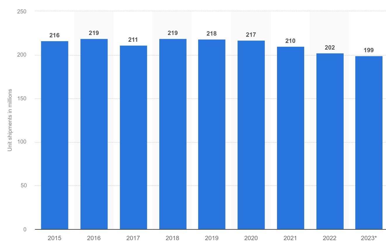 Количество поставленных телевизоров в мире по годам, млн единиц; прогноз на текущий год — от января 2023 г.