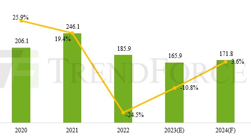 Как уже сообщали ранее исследователи из Canalys, за IV кв. минувшего года впервые за долгое время был зафиксирован годовой прирост поставок ноутбуков — примерно на 4%.В компании TrendForce, в свою очередь, считают, что примерно таким же окажется увеличение отгрузок мобильных ПК по итогам всего 2024 г., — +3,6%, до 172 млн единиц. Другое дело, что этот позитивный тренд далеко не восполнит провальный итог минувшего года: всего за 2023 г., сообщают аналитики, в мире было поставлено 166 млн ноутбуков, что на 10,8% меньше, чем годом ранее (см. рисунок).