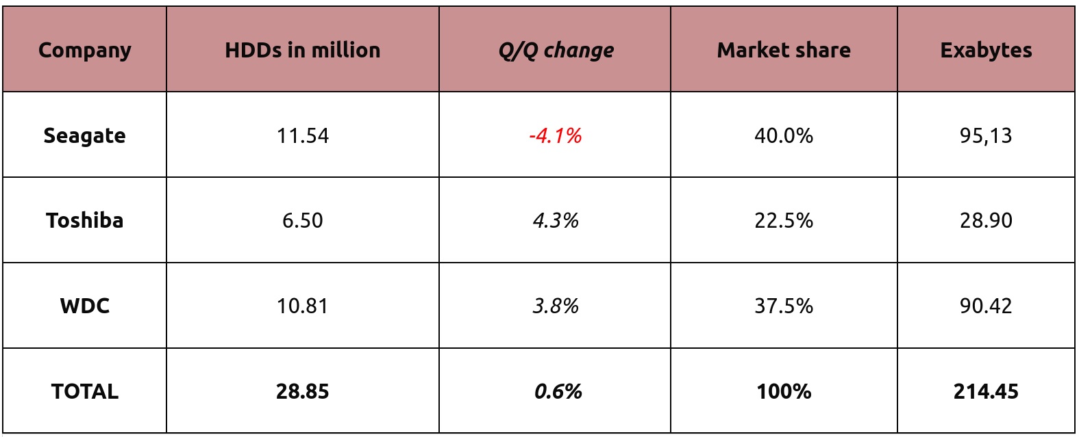 Среди трёх сохранившихся в мире производителей HDD единственный, Seagate, продемонстрировал рост отгрузок брендированных магнитных дисковых накопителей и в мобильном, и в настольном форм-факторах. Правда, за счёт резкого сокращения поставок 3,5-дюймовых HDD для систем видеонаблюдения по количеству отгруженных устройств он всё-таки не дотянул до собственных результатов III квартала (см. таблицу). Компания Toshiba отчиталась о внушительном, на 15% квартал к кварталу (до 700 тыс. единиц), росте отгрузок высокопроизводительных корпоративных HDD, зато её брендированные накопители общего назначения отгружались хуже, чем кварталом ранее. Наконец, компания Western Digital (WDC) показала 20%-ный прирост поставок архивных жёстких дисков (nearline HDD), до 3,90 млн единиц; причём в пересчёте на ёмкость взлёт отгрузок WDC в этом подсегменте оказался ещё выше — +22,5%, до 66,71 Эбайт.