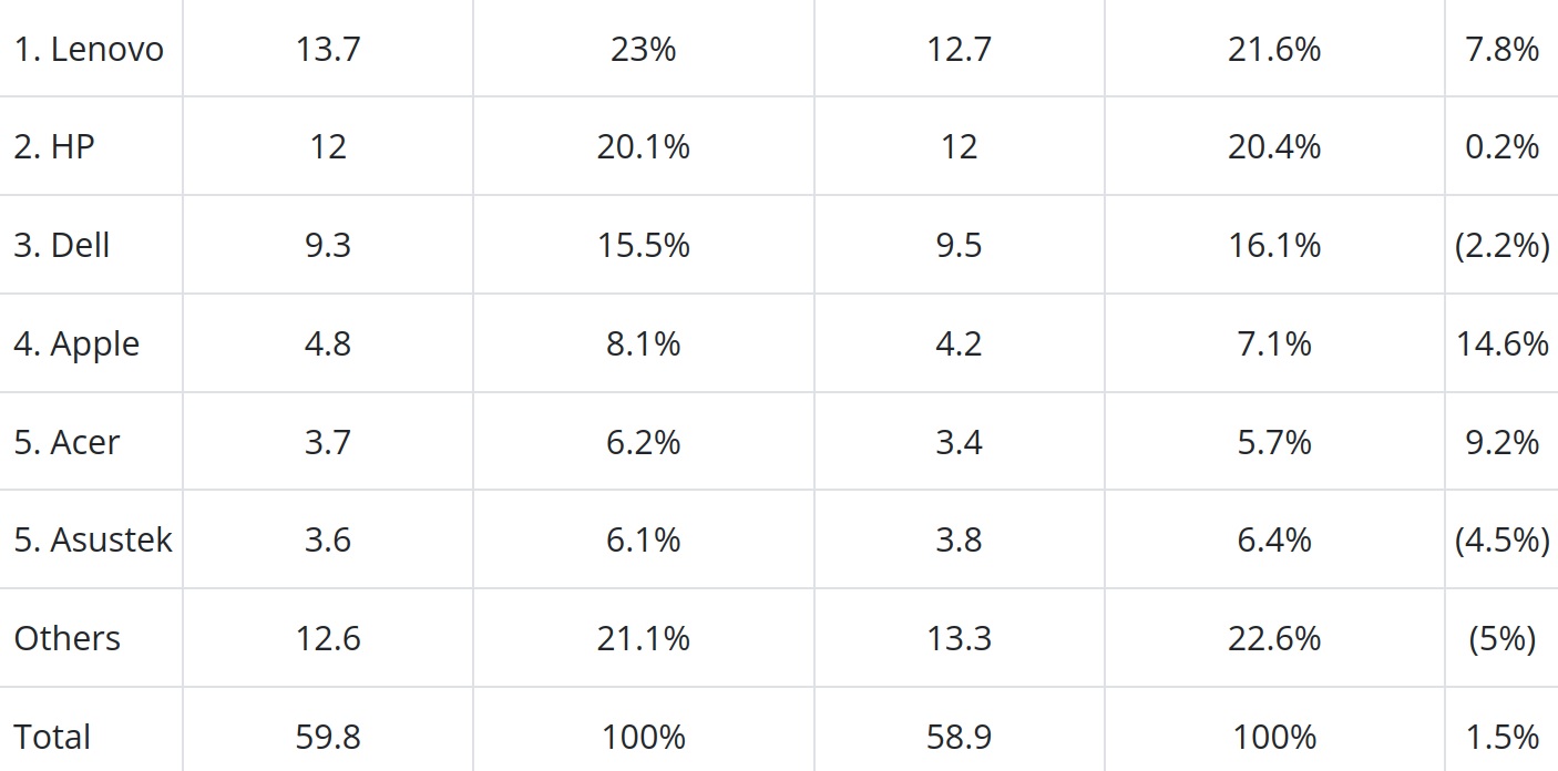 По данным компании IDC, за первые три месяца текущего года в мире было отгружено 59,8 млн персональных компьютеров всех разновидностей, — на 1,5% больше, чем за тот же квартал годом ранее. Сам по себе такой прирост поставок может и не впечатлять: во-первых, период с января по март в данном сегменте ИТ-рынка традиционно демонстрирует сниженные результаты по сравнению с другими кварталами, поскольку включает долгое празднование китайского Нового года и потому значительно меньшее число дней на сборочных предприятиях. Во-вторых, I кв. 2023 г. стал, по утверждению аналитиков IDC, худшим кварталом по относительной глубине провала отгрузок за всю историю мирового компьютерного рынка, — спад тогда достиг 28,7% год к году.