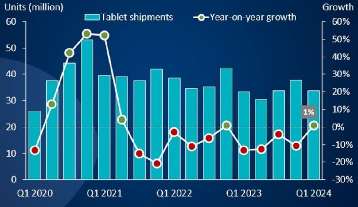 После пандемийного всплеска, когда динамика поставок планшетов год к году оставалась положительной пять кварталов подряд, этот сегмент глобального ИТ-рынка перешёл в состояние плавного снижения с редкими и краткими возвратами к положительным величинам прироста отгрузок. Прежний такой возврат наблюдался в IV кв. 2022 г., вслед за пятью последовательными кварталами отрицательной динамики. Второй подъём аналитики Canalys зафиксировали по итогам I кв. 2024 г., за который в мире в канал продаж было поставлено 33,7 млн планшетов, что примерно на 1% больше, чем за тот же период прошлого года (см. рисунок).