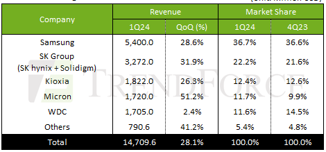 Среди поставщиков брендированных микросхем NAND на первом месте по выручке продолжает оставаться компания Samsung, за ней почти с двукратным отрывом следует SK Group, а замыкают пятёрку лидеров с примерно равными долями Kioxia, Micron и WDC (см. рисунок). Учитывая, что средняя цена за партию чипов флэш-памяти за квартал увеличилась в мире примерно на 15%, в TrendForce ожидают, что и по итогам II кв. 2024-го выручка поставщиков микросхем этого типа снова вырастет, по меньшей мере, на 10% к уровню января-марта.