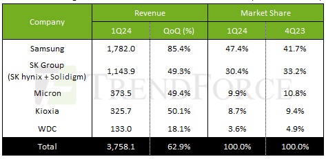 Продолжается отмеченный TrendForce ещё в конце прошлого года рост спроса на корпоративные SSD, приводящий, в свою очередь, к уверенному увеличению выручки поставляющих такого рода накопители компаний. По новой оценке аналитиков, сочетание удерживающейся на высоком уровне потребности заказчиков с дальновидным планированием темпов поставок SSD в канал продаж (таким, чтобы не допускать ни перебоев с отгрузками даже крупных партий, ни ведущего к волатильности отпускных цен затоваривания) выразилось во внушительном росте доходов поставщиков полупроводниковых накопителей по итогам I кв. 2024 г. — на 62,9% квартал к кварталу; до 3,758 млрд долл. США.
