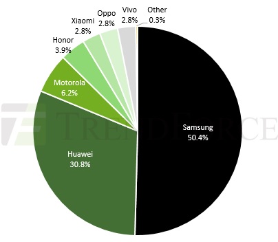 Ещё в 2022 г., отмечают в TrendForce, на Samsung приходилось свыше 80% мировых поставок складных смартфонов, тогда как сейчас эта компания с огромным трудом удерживает лишь около половины данного сегмента. На втором месте более чем с 30% уверенно держится бренд Huawei, а третье отстаивает Motorola c 6,2% — примерно вдвое превосходя по занимаемой доле сегмента каждый из четырёх догоняющих её брендов (см. диаграмму). Аналитики предполагают, что разительных перемен в этой таблице лидерства не приходится ожидать до тех пор, пока Apple не выпустит на рынок свой складной iPhone, неподтверждённые слухи о разработке которого циркулируют в ИТ-кругах уже не первый год.