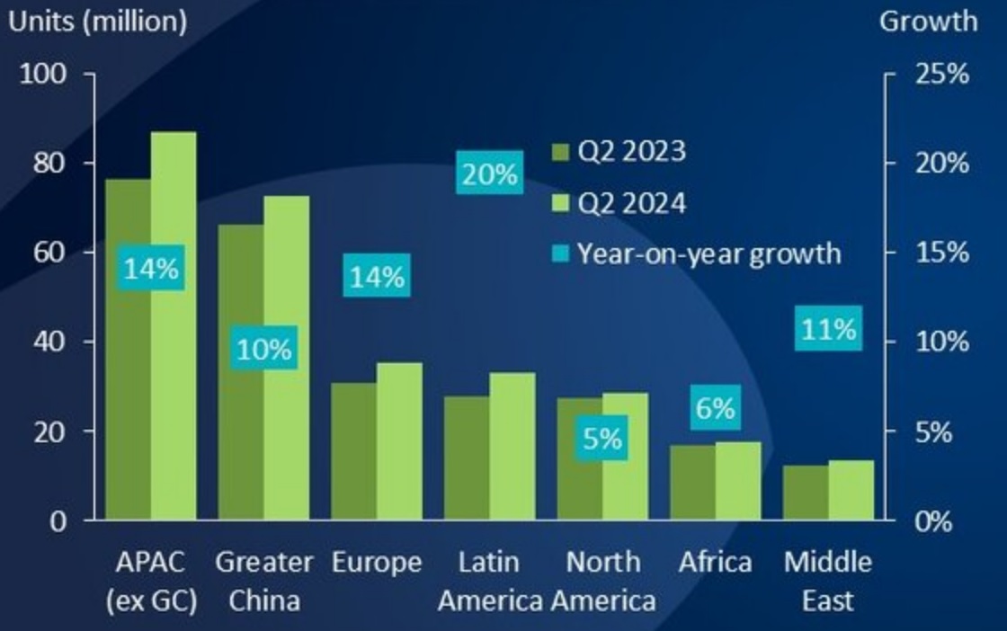 Мировые поставки смартфонов по регионам, млн единиц, за II кв. 2024 г. (светло-зелёные столбцы) по сравнению с тем же периодом 2023 г. (тёмно-зелёные)