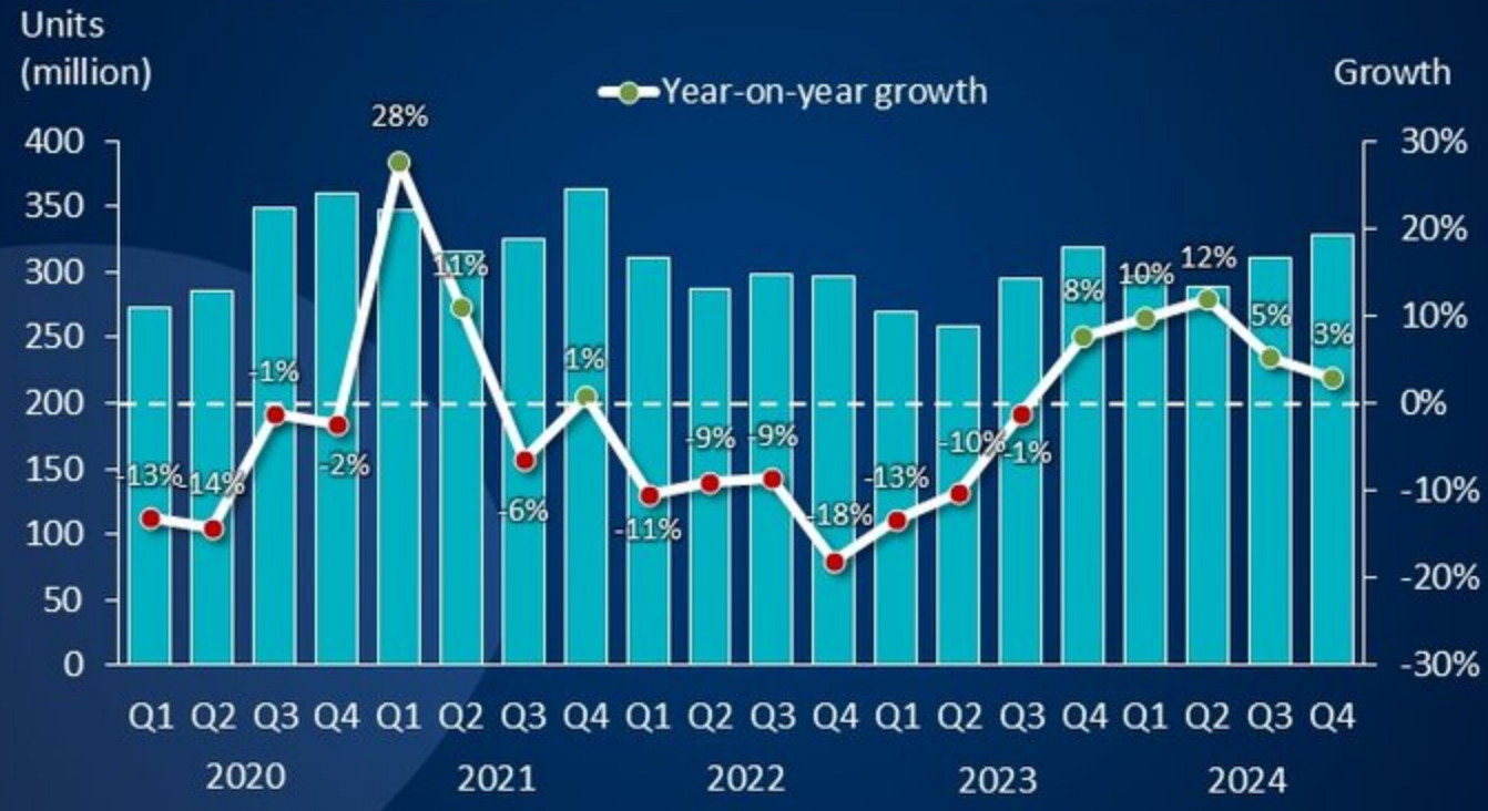 С I кв. 2022 г. по III кв. 2023-го глобальные поставки смартфонов демонстрировали уверенно отрицательную динамику, порой с двузначными значениями сокращения отгрузок год к году. Тенденция эта была преодолена в IV кв. 2023 г., и с тех пор вот уже пять кварталов подряд смартфонов в мировой канал продаж поставляется больше, чем за аналогичный период годом ранее. Последние три месяца минувшего года не стали исключением: по данным Canalys, за IV кв. 2024-го в мире было отгружено 330 млн смартфонов, что соответствует росту на 3% в годовом выражении. Правда, это меньше аналогичного показателя для всех предшествующих «положительных» кварталов, и значительно меньше достигнутого во II кв. 2024 г. 12%-ного пика (см. рисунок). Аналитики опасаются, что по мере насыщения платёжеспособного спроса отгрузки смартфонов уже в начале 2025 г. вновь могут оказаться по динамике в «красной» зоне.