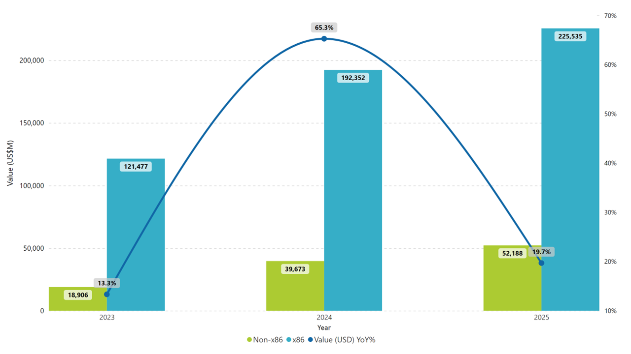 (отдельно по серверам с процессорами архитектур х86 и иных), столбцы, млн долл. США, и его динамики, линия, %, правая шкала