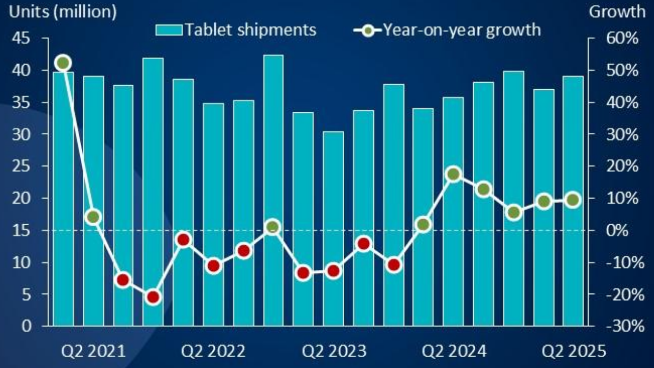 Согласно подсчётам Canalys, в мировой канал продаж за II кв. 2025 г. отгрузили 39 млн планшетов, что на 9% больше, чем за аналогичный период прошлого года, и на 5% больше, чем за первые три месяца текущего. Причин тому аналитики видят сразу две: высокий спрос на «таблетки» в КНР и в регионе EMEA, а также начало реализации в Японии масштабной образовательной программы GIGA School, в рамках которой только за первое полугодие 2025-го были закуплены 11 млн хромбуков, терминальных планшетов, предназначенных в первую очередь для веб-сёрфинга и доступа к облачным сервисам Google.