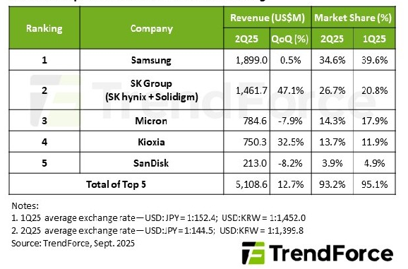 В компании TrendForce зафиксировали ощутимое повышение выручки в сегменте корпоративных полупроводниковых накопителей по итогам II кв. 2025 г. За указанные три месяца только ведущие по объёмам поставок пять компаний — Samsung, SK Group (SK hynix и Solidigm), Micron, Kioxia и SanDisk — получили в совокупности за свою продукцию 5,1 млрд долл. США, это на 12,7% больше, чем за первый квартал того же года. Аналитики указывают, что рост потребностей конечных заказчиков в корпоративных SSD подстегнули как вывод Nvidia на рынок новейших серверных ускорителей архитектуры Blackwell (и, соответственно, необходимость создавать оснащённые ими специализированные для ИИ-задач серверы), так и очередной цикл расширения североамериканскими облачными провайдерами своих классических дата-центров.