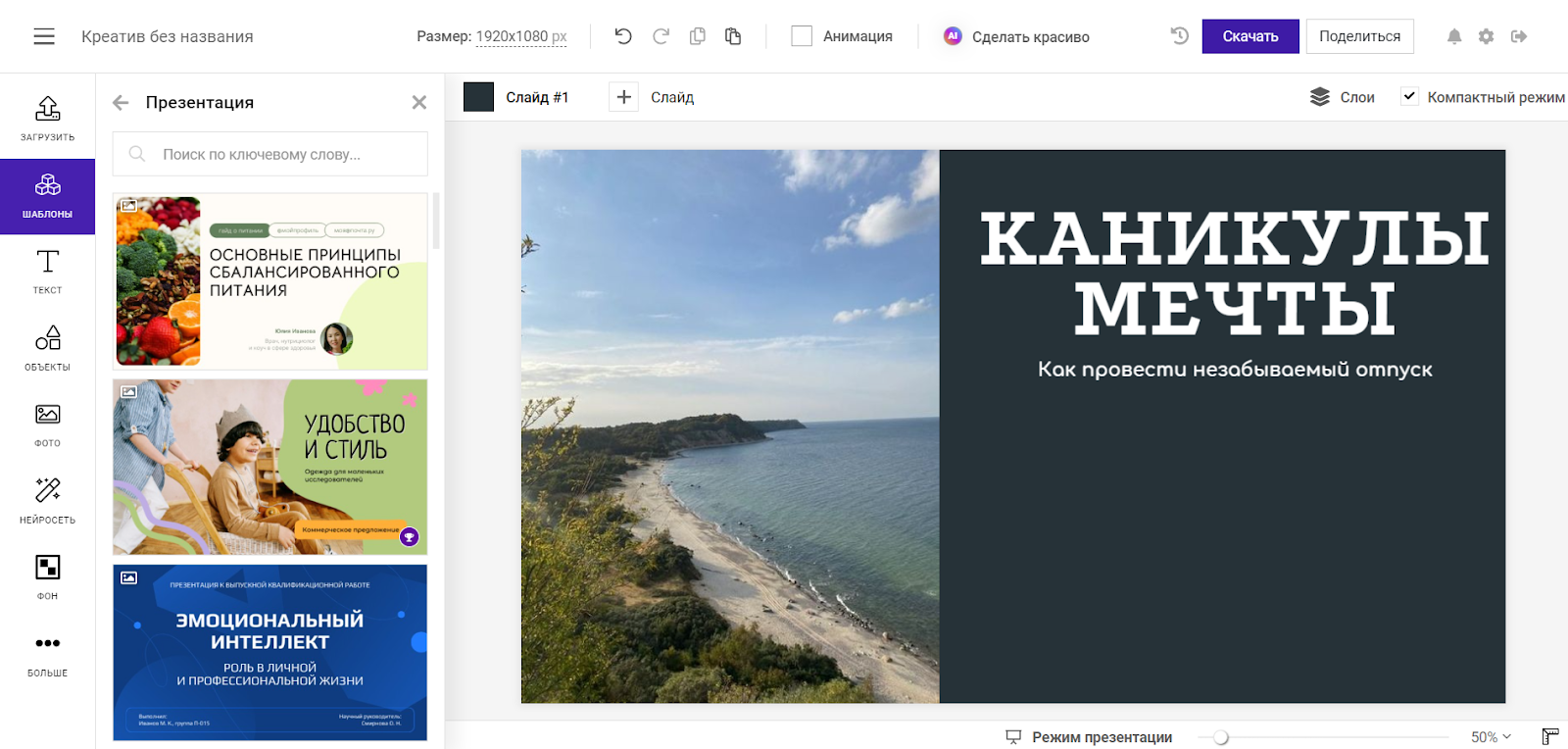 В Supa можно сделать визитку, коллаж, обложку для видео, рекламу, инфографику для маркетплейса. И в том числе презентацию.