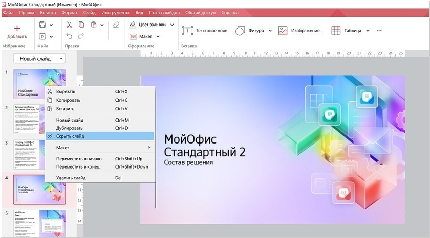 Пользователю доступны почти все существующие функции: добавление картинок и текста, работа с фигурами, фонами и дизайнами, перемещение и удаление слайдов и прочие. Презентацию можно проиграть в «Показе слайдов». Если над проектом работают сразу несколько человек, в разделе «Файл» нужно предоставить общий доступ к документу.