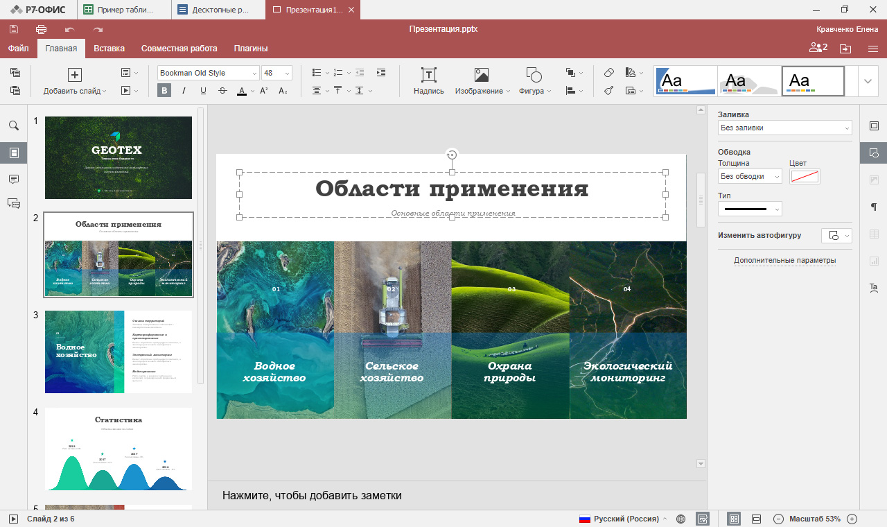 В редакторе презентаций Р7-Офис почти такой же набор стандартных опций, как у предыдущего аналога, но возможностей больше. Например, текст добавляется на слайд в обеих программах. Но в Редакторе презентаций можно настроить параметры объектов Text Art: расположить слова полукругом или галочкой при помощи инструмента «Трансформация», выбрать стиль текста в параметре «Шаблон» и т. д.