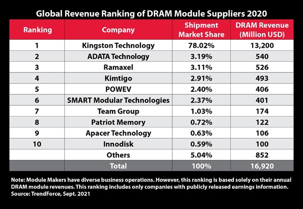 Корпорация Kingston Technology со ссылкой на отчет авторитетной аналитической компании TrendForce сообщила о своем лидерстве на мировом рынке DRAM-модулей по итогам 2020 г.