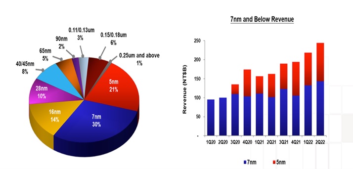 Примечание: Круговая диаграмма — доли выручки, приходящиеся на поставки чипов, изготовленных по различным технологическим нормам, за II кв. 2022 г., Столбчатая диаграмма — величина поквартальной выручки для техпроцессов 7 нм и 5 нм, млрд новых тайваньских долларов (100 NTD = 3,35 USD)