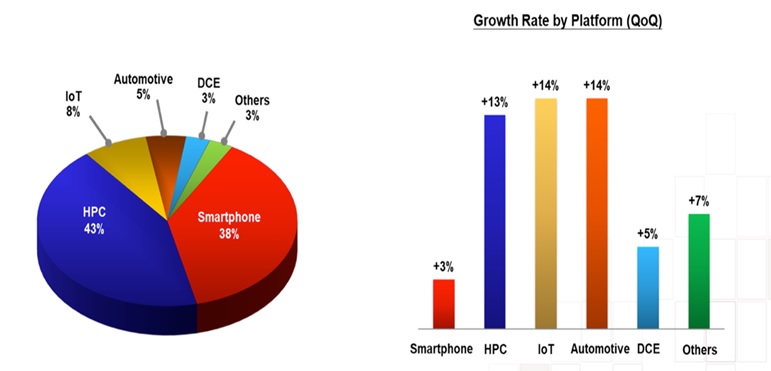 Примечание: Круговая диаграмма — доли выручки TSMC, приходящиеся на поставки чипов для различных устройств: смартфонов, высокопроизводительных серверов (high-performance computing, HPC), элементов Интернета вещей (Internet of Things, IoT), автомобилей, телекоммуникационного оборудования (data communications equipment, DCE) и др., за II кв. 2022 г., Столбчатая диаграмма — рост год к году этих долей,%.