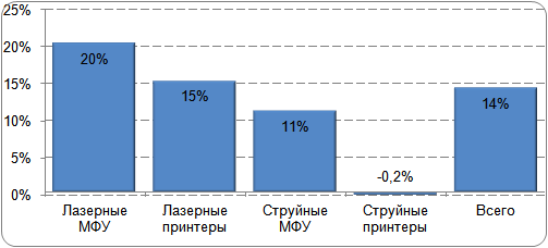 В струйном сегменте наоборот, наблюдалось снижение темпов роста в категории настольных МФУ (до 11% против 15% в 2010 г.), а однофункциональных струйных принтеров в 2011 г. было продано примерно столько же, что и годом раньше.