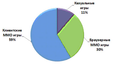 Если в текущей структуре рынка явно преобладают Клиентские ММО игры (см. рис.) то к 2012 году доля казуальных игр вырастет до 22%. При этом доля клиентских игр будет снижаться.