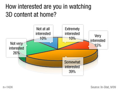 После внедрения 3D в кинотеатры от разработчиков естественно ожидать попыток распространения объемного изображения и на ТВ. А как к такому новшеству относятся телезрители? Согласно опросу, недавно проведенному компанией In-Stat (www.in-stat.com), в общем потребители заинтересованы в получении дома 3D-ТВ, причем среди тех, кто хотя бы два-три раза смотрел объемные фильмы в кинотеатрах, обнаружилось больше заинтересованных в 3D-ТВ.