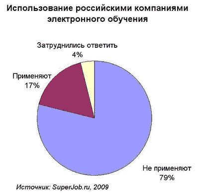 Среди отечественных работодателей использование электронного обучения в работе с персоналом также не слишком распространено. Как оказалось, только 17% компаний учат свой персонал онлайн. Технологии «электронного обучения» довольно часто применяют крупные компании, в штате которых работают от 5 тыс. человек (50%).