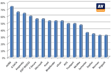 Список возглавил антивирусный продукт AVIRA AntiVir Premium, определивший 74% вредоносного ПО. За ним следуют G DATA Antivirus и Kaspersky AntiVirus с 66% и 64%, соответственно. На четвертой и пятой позиции — ESET NOD32 Antivirus (60 %) и F-Secure Antivirus (56%) (см. рис.).
