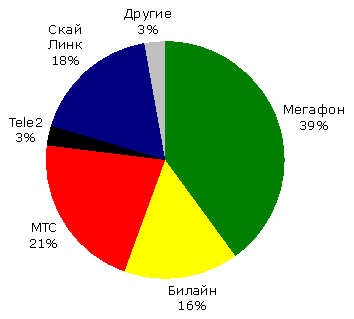 Лидером в сегменте мобильного интернета является компания «Мегафон». Ее пользователи сгенерировали 39% всего трафика. Позиции компании «Скай Линк» в 2009 г. значительно ослабли: доля компании в общей структуре трафика снизилась на 6%, до 18%.