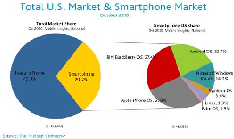 ~PREVIEW_TEXT--Согласно новым данным исследователей из The Nielsen Company, 29.7% американских подписчиков на мобильные услуги сейчас имеют смартфон на базе полной ОС. Наиболее популярны Apple iPhone и RIM Blackberry, в США на каждую из них …