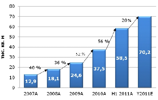По сравнению с прошлым годом наблюдается очень сильный рост рынка, уже показатели первого полугодия 2011 г. на 56% превышают цифры 2010 г. в целом, а экстраполяция до конца года дает годовую динамику на уровне 87%