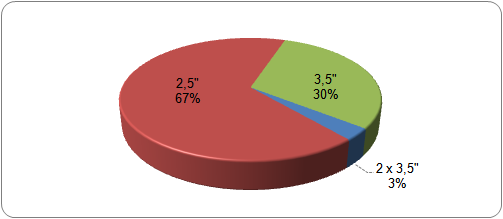 Рост средней емкости внешних HDD протекает всё так же планомерно: сейчас наиболее популярны 2,5″ 500Gb и 1000Gb модели, стали заметно популярнее 2Tb 3,5″ диски. Двухдисковые боксы набирают популярность, сейчас их доля оценивается приблизительно в 3% от предложения (см. рис.).