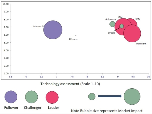 В лидеры в данном исследовании включены компании ЕМС, IBM и Open Text. Компании Autonomy и Oracle по методике Ovum отнесены к группе challengers, а Alfresco и Microsoft — к группе followers (см. рисунок).