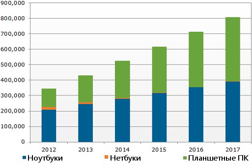 Как ожидается, продажи ноутбуков вырастут с 208 млн шт. в 2012 г. до 393 млн в 2017 г., в то время как число реализованных планшетов за аналогичный период увеличится почти в 4 раза — с 121 до 416 млн шт.