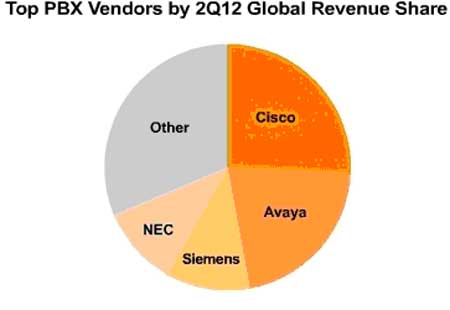 Во 2-м кв. 2012 г. свое лидерство в сегменте больших и малых УАТС упрочила компания Cisco Systems, на чью долю пришлось более четверти мирового объема этого сегмента (см. круговую диаграмму). На фоне снижения общего объема рынка хорошие результаты за этот период показали компании Microsoft, Samsung, ShoreTel и Mitel, поквартальный рост которых выражался двузначными цифрами.