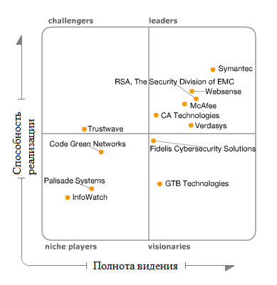 Оценивая рынок DLP в формате «магического квадранта» (см. рис.), к числу лидеров рынка Gartner относит компании Symantec, Websense, RSA, McAfee, CA Technologies и Verdasys, а к «провидцам» в терминологии квадранта – General Dynamics Fidelity Cybersecurity Solutions и GTB Technologies. Группу нишевых игроков составили Code Green Networks, Palisade Systems и InfoWatch (напомним, что об успехах этой российской компании мы писали отдельно – прим. ред.), а компанию Trustwave аналитики в сектор конкурентов.
