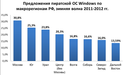 В Дальневосточном и Сибирском федеральных округах отмечено наиболее заметное падение доли пиратских предложений ОС Windows за последний год (с 27 до 14% и с 22 до 17% соответственно). Значительным увеличением показателя пиратских предложений за год отличились Северо-Западный федеральный округ (с 12 до 16%) и г. Москва (с 27 до 31%).