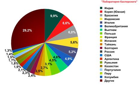 Еще одной особенностью минувшего месяца стало равномерное распределение потоков спама по странам. Так, если в