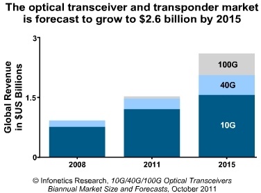 Общий объем мирового рынка трансиверов, включая оптическое оборудование 10G, 40G, и 100G, согласно исследованию Infonetics, в 2010 г. составил 1,2 млрд долл. Суммарный рост рынка в первой половине 2011 г. по сравнению с тем же периодом 2010 г. достиг 35%. Такие показатели роста позволили аналитикам прогнозировать, что в 2015 г. объем рынка в целом увеличится до 2,6 млрд долл. При этом общая доля сегментов 40G и 100G к 2015 г. составит не менее 40%.