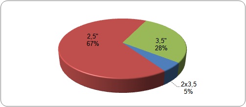 В розничной продаже в Петербурге вновь появились двухдисковые накопители производства WD (см. рисунок), а 1,8"-диски, напротив, исчезли. Доля 3,5"-дисков несколько возросла с момента последнего исследования, потеснив 2,5"-устройства. Вероятно, это связано с появлением более емких дисковых накопителей (сейчас максимальный объем 3,5"-диска составляет 3 Тб). Также уже достаточно много и 2,5"-дисков объемом 1 Тб (максимально достигнут показатель в 1,5 Тб).