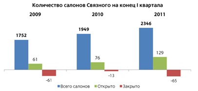 На конец 1-го квартала 2011 г. количество центров мобильной связи компании «Связной» достигло 2346 в 689 городах РФ. По отношению в аналогичному периоду 2010 г. количество салонов увеличилось на 20% (подробнее см. в таблице и на диаграмме).