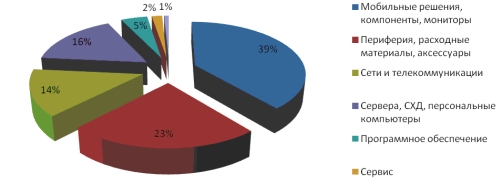 Динамика продаж сильно различалась в разных продуктовых сегментах. Наибольшая активность наблюдалась в сегменте мобильных решений (включает ноутбуки) — бизнес по этому направлению вырос в OCS почти в два раза, оно же занимает и самую большую долю в структуре оборота. Кроме того, компания существенно усилила направление ПО, хотя его доля пока еще невелика (см. рисунок).