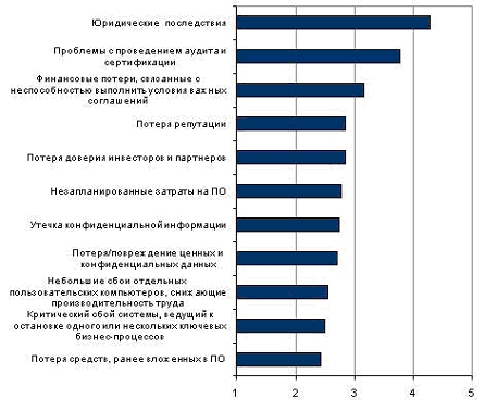 Уровень значимости для респондентов различных типов рисков, представлен на рисунке, который обобщает результаты ответов на вопрос: «Если компания, аналогичная Вашей, использует нелицензионные программные продукты, насколько высока вероятность, что она столкнется со следующими проблемами? (По шкале от 1 до 5, где „1“ — низкая, „5“ — высокая)»