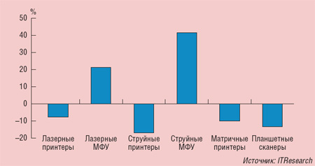 В первом полугодии 2008 г. развитие рынка периферийных устройств замедлилось, показав вдвое меньшие темпы роста продаж, чем годом раньше. Общий объем проданных принтеров, настольных МФУ и планшетных сканеров составил 2,64 млн шт., что на 4,6% больше, чем в первой половине 2007 г. (в тот период показатель роста был около 10%).