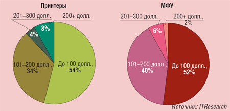 Интересно, что противоположное направление структурных сдвигов (в сторону low-end у МФУ и более профессиональных моделей у принтеров) заметно сблизило распределение продаж этих устройств по ценовым категориям. В первом полугодии сходство структуры двух сегментов оказалось довольно явным (рис. 3). Соответственно, выровнялась и средневзвешенная розничная цена струйных принтеров и МФУ (около 125 долл.), у первых она за год возросла на 3%, а у вторых уменьшилась почти на 8%.