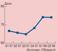 Общему снижению объема продаж способствовал довольно значительный рост цен в конце прошлого и начале текущего года, вызванный, в частности, изменением схем импорта многих категорий сканеров (как, впрочем, и некоторых других продуктовых групп). Естественно, что в наибольшей степени это сказалось на самых массовых сканерах стоимостью до 100 долл., продажи которых заметно снизились. Сравнительно небольшое по абсолютной величине удорожание (на несколько долларов) может психологически выглядеть гораздо заметнее на фоне малой цены некоторых популярных моделей (подняв их стоимость на 15% и более). В среднем розничная цена планшетных сканеров нижнего уровня возросла по сравнению с I полугодием 2007 г. почти на 12% (рис. 4), что не могло не повлиять отрицательно на спрос. Возможно, что отмеченное выше улучшение показателей II квартала вызвано «эффектом привыкания» к новым, более высоким, ценам, который довольно часто наблюдается на массовом рынке после резкого изменения стоимостной конъюнктуры.