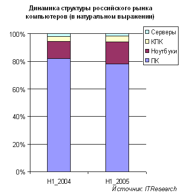 Общий объем рынка компьютеров (ПК, ноутбуки, КПК, серверы на платформе Intel) составил 2380 тыс. шт. Около 78,1% продаж в натуральном выражении приходится на настольные ПК, 15,8% -- на ноутбуки, 4,1% -- на карманные компьютеры (КПК) и примерно 1,9% -- на серверы стандартной архитектуры. По сравнению с первым полугодием 2004 г. рынок настольных ПК вырос на 12,1%, рост серверного сегмента немного превысил 20%. Но наибольший прирост объемов произошел в портативном секторе: продажи ноутбуков выросли более чем на 54,3%, а КПК -- на 27,3%. Общие же показатели темпов развития российского рынка компьютеров составили 17,8%.