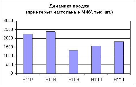В первом полугодии 2011 г. во всех сегментах офисных устройств, составляющих основную часть рынка hardcopy (принтеров, настольных МФУ, планшетных и документных сканеров), показатели продаж были лучше, чем в соответствующий период 2010 г. Хотя начало года традиционно — не самое благоприятное временя с точки зрения покупательской активности как в корпоративном, так и в домашнем потребительских секторах, все же восстановление спроса (за исключением отдельных категорий продуктов) идет не так быстро, как можно было ожидать после резкого спада 2009 г.