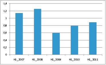 Показатели первого полугодия прошлого года были превышены на 12% и 24% соответственно. Двукратный разрыв в темпах роста (рис. 2) показывает усиление тренда к «утяжелению» рынка.