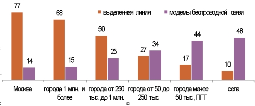 В Москве, а также в крупных и средних городах страны, где есть выбор и достойная конкуренция технологий и тарифных планов, у «беспроводки» относительно скромное место, например, в столице всего 14% от общего числа подключений к Интернету. Но в провинции ситуация другая. Достаточно обратить внимание на населенные пункты с числом жителей от 250 до 50 тыс. чел. Уже здесь модемы беспроводной связи одерживают верх над подключениями по выделенным линиям связи (34% против 27%). Еще сильнее перевес в сторону «беспроводки» в малых городах с населением до 50 тыс. жителей и в поселках городского типа и уж совсем капитально беспроводной выход в Сеть побеждает на селе (48% против 10%).