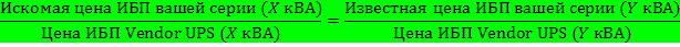 Для более точного определения цены интересующего вас ИБП потребуется дополнительная информация, а именно: необходимо знать цену любого другого ИБП той же серии. Допустим, у вас, или у ваших друзей есть такой ИБП, вы считаете его цену адекватной и хотели бы приобрести ИБП той же серии, но другой мощности. В этом случае для уточнения цены может быть использована таблица 1. Дело в том, что таблица, по сути, составлена так, как если бы все представленные в ней ИБП были одной серии (для удобства, пусть это будет все тот же достопочтенный Vendor UPS). А, как не трудно догадаться, если стоимость ИБП вашей серии отличается от равномощного ему Vendor UPS, скажем, на 10%, то и при любой другой мощности отклонение составит все те же 10%. Стало быть, для уточнения цены интересующего вас ИБП достаточно составить пропорцию:
