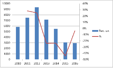 Рис. 1. Объем продаж и годовая динамика рынка ноутбуков в 2010-2016 гг. (в тыс. шт.).