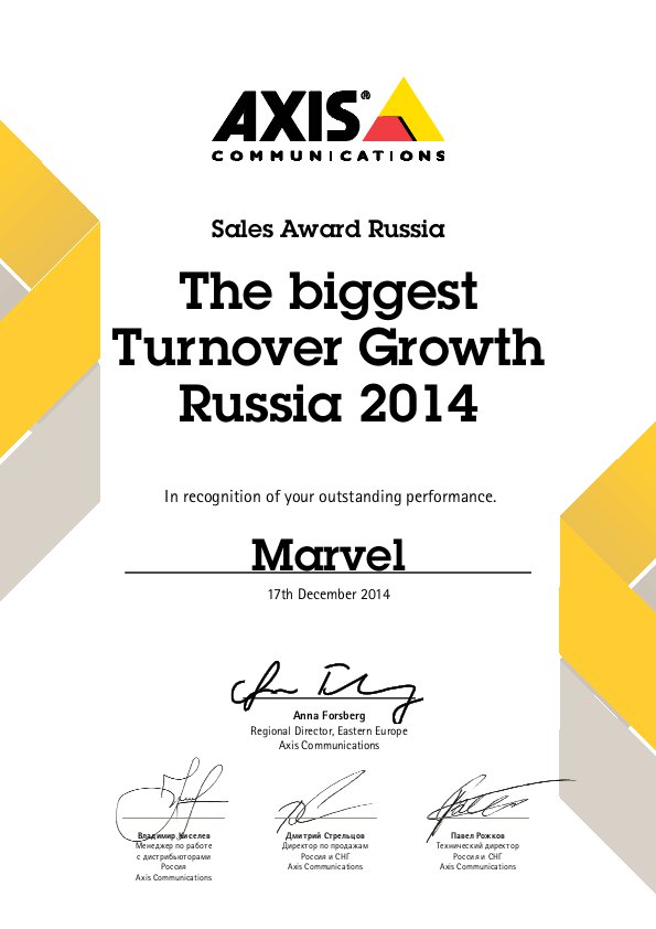 Являясь одним из самых молодых дистрибуторов вендора, компания «Марвел» оказалась и самым быстрорастущим. Продажи оборудования Axis увеличились на 141% по сравнению с прошлым годом. Кроме того, несмотря на замедление роста партнерской сети, в 2014 году было реализовано больше проектов, чем в предыдущем.