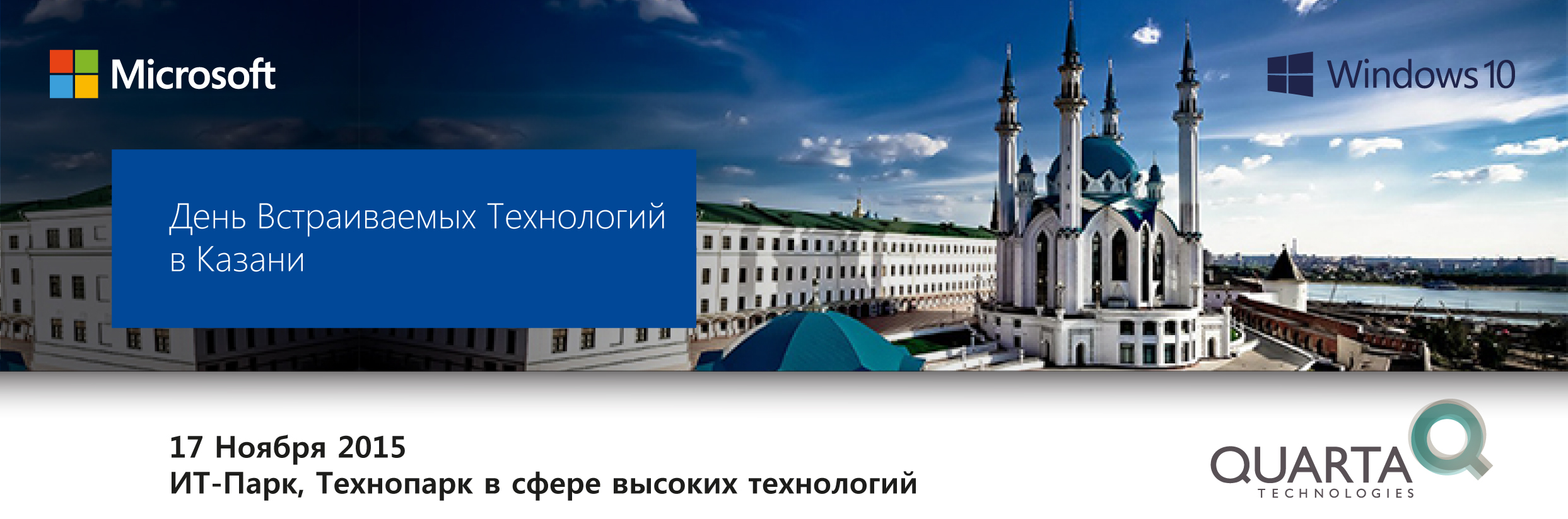 17 ноября 2015 года компания «Кварта Технологии» впервые организует семинар «День Встраиваемых Технологий в Казани: Windows 10 IoT и Интернет Вещей». Мероприятие пройдет в самом центре деловой части столицы Республики Татарстан, в комплексе «ИТ-парк», который является технопарком в сфере высоких технологий, занимающийся разработками и развитием компаний в сфере информационных технологий.